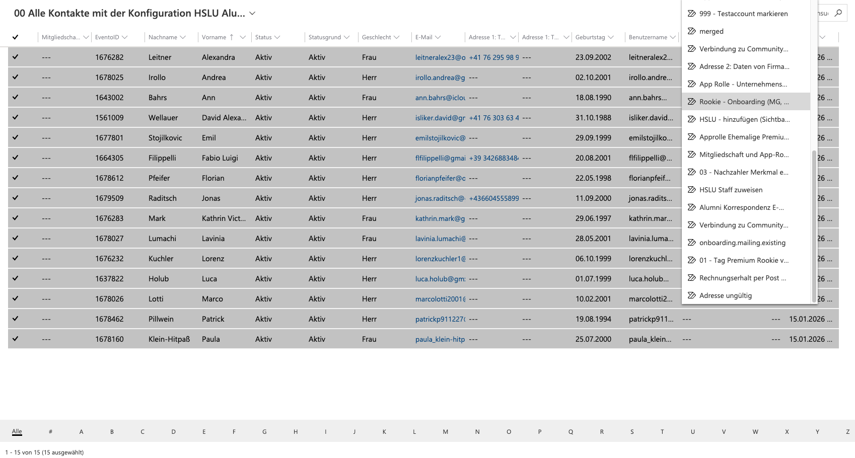 Workflow "Rookie - Onboarding (MG, App-Rollen, Newsletter)" auf Kontakte anwenden.